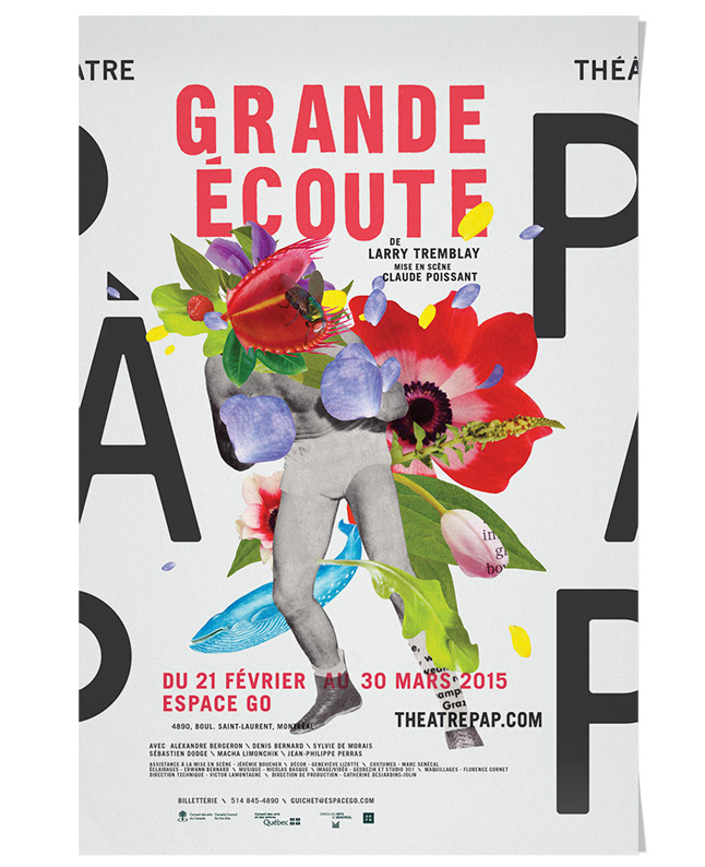 Designs created for the 2014-2015 season for the Théâtre PÀP in Montreal. Inspired by the theatre’s daring and experimental nature, bright collages were used to communicated a vibrant and chaotic energy.